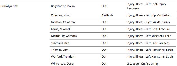 另外,本西蒙斯左小腿酸痛、卡梅隆-约翰逊右脚踝扭伤、小托马斯左腿筋扭伤、沃特福德左腿筋扭伤,今日未出战名单高达8人(拉塞尔在赛中受伤也退了)。