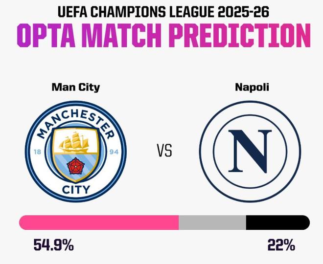 知名数据机构Opta预测曼城本场赢球概率54.9%,那不勒斯赢球可能性22%,平局概率23%。