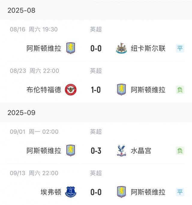 进攻哑火!维拉开赛2平2负陷降级区,全队身价英超第九却1球未进