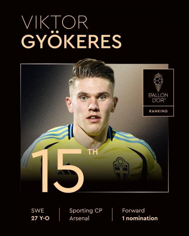 阿森纳前锋约克雷斯排名第15名,这是他第1次获得提名。