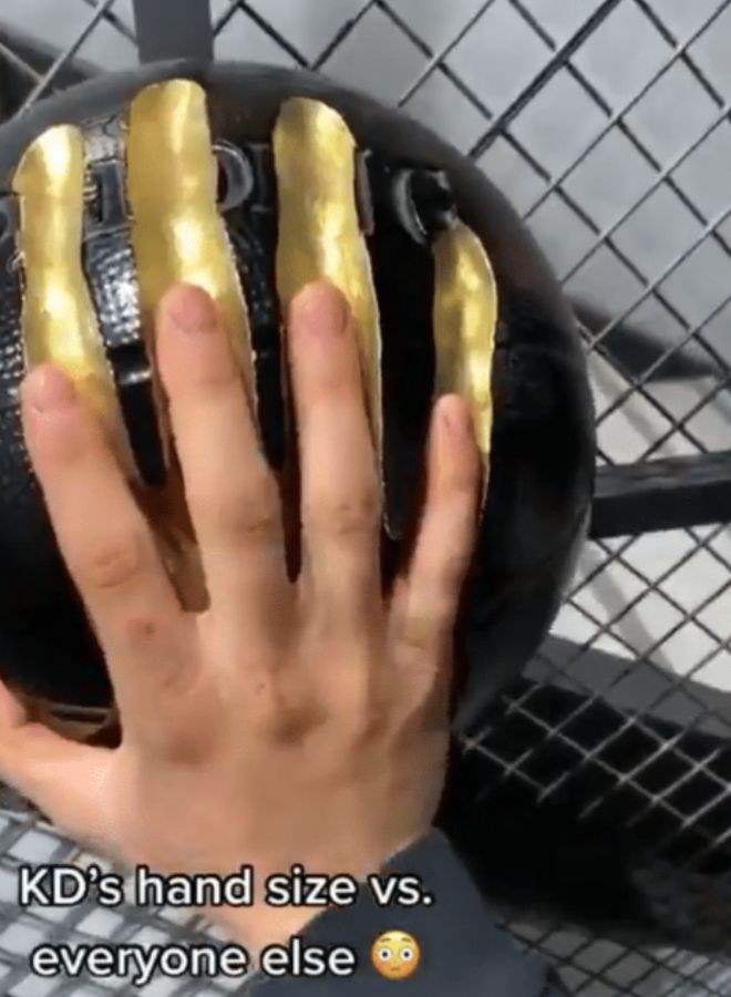 凯文・杜兰特在进攻端是死神一般的存在,但是他的身体强壮程度绝对是联盟中游以下的水准,球迷总是担心,杜兰特瘦如麻杆的身体,在和联盟一些野兽前锋对抗时,被撞散架。但是,杜兰特除了拥有 “2 米 11 的身高却能像后卫一样运球”外,他的 “巨掌” 也是联盟公认的 “身体杀器”。看过杜兰特比赛的人都知道,他能轻松单手抓球完成假动作,能在突破时稳稳控制住球权,甚至能在防守端单手断下对手的传球 —— 这些动作的背后,都离不开他远超常人的手掌尺寸。