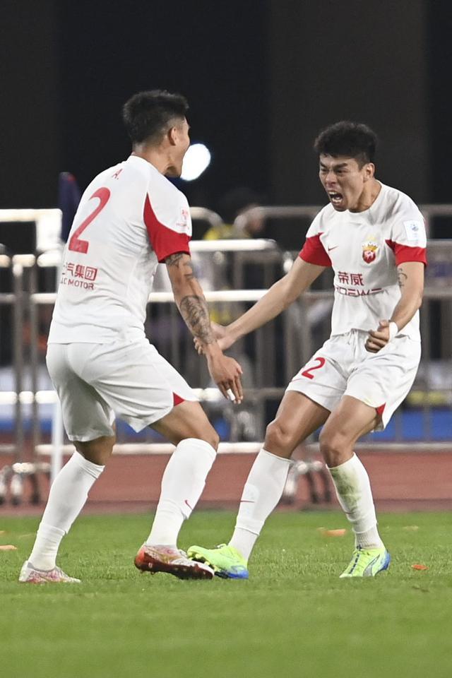 2024年11月23日,上海海港队球员李帅(右)庆祝进球。 当日,在浙江温州奥体中心体育场举行的2024赛季中国足球协会杯决赛中,上海海港队3比1战胜山东泰山队,获得冠军。 新华社记者 黄宗治 摄