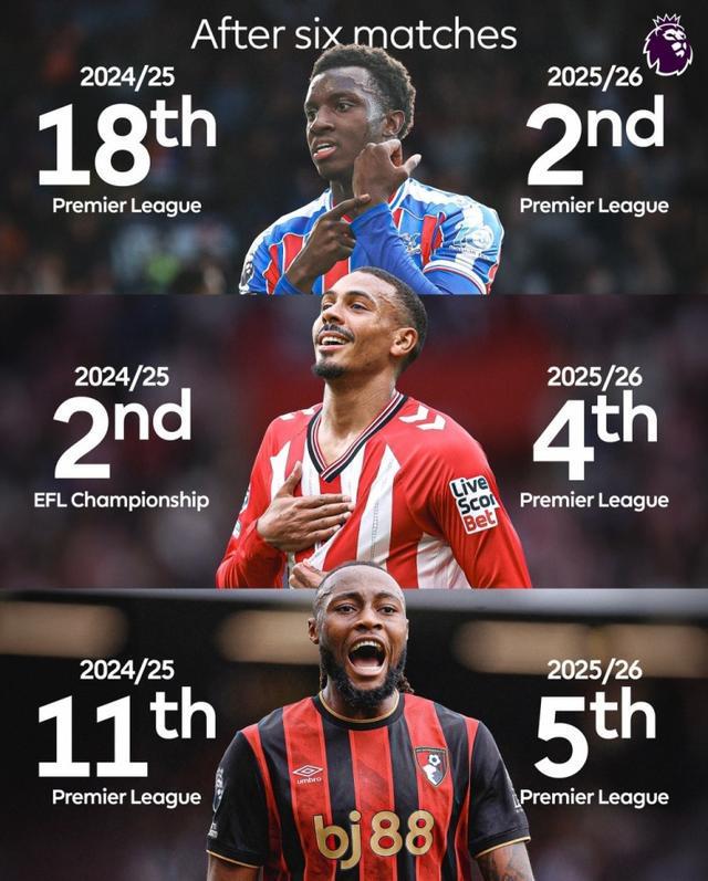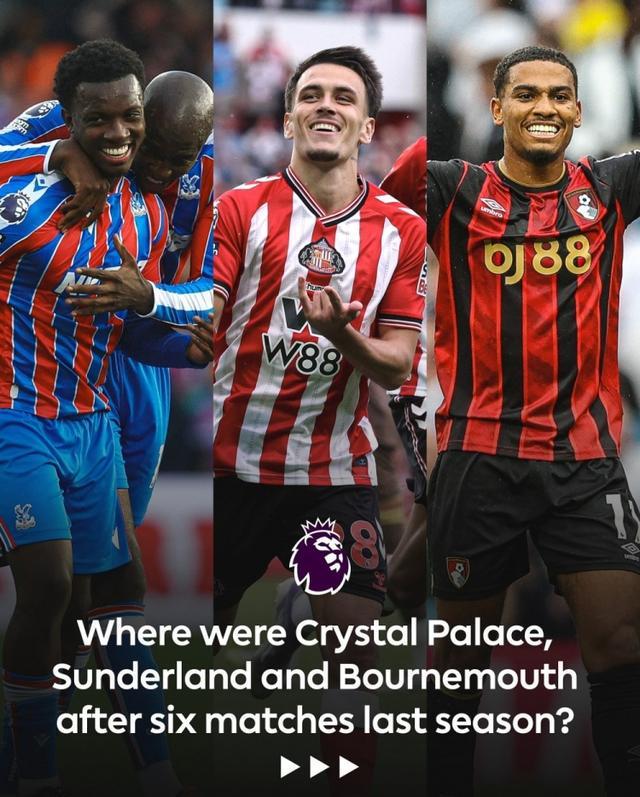 直播吧9月28日宣 英超官方更新社媒动态,称赞水晶宫、桑德兰、伯恩茅斯本赛季的表现。