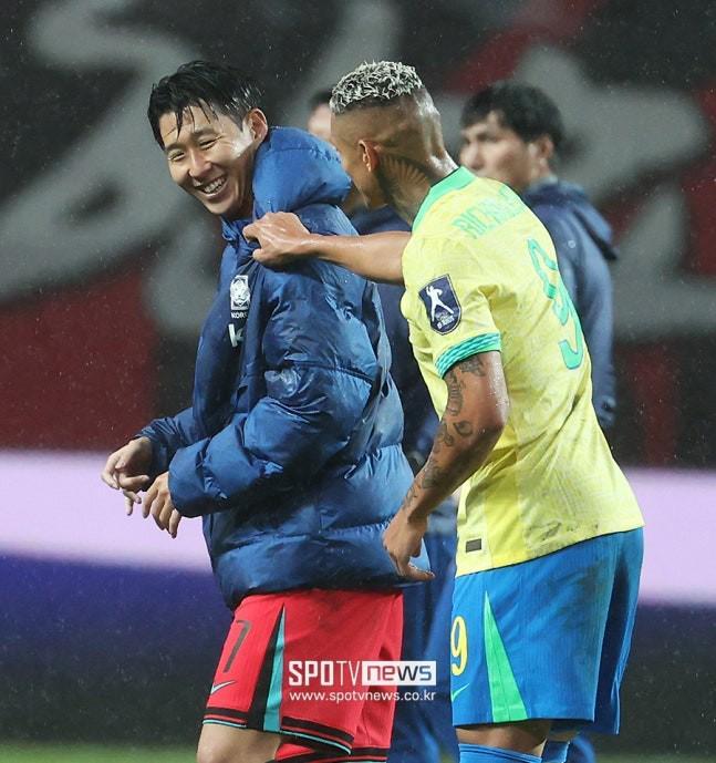 老友相见,巴西大胜韩国赛后,里沙利松与孙兴慜交谈并拥抱