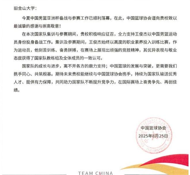 - CBA | 中国篮协给旧金山大学发去感谢信:感谢对王俊杰的培养