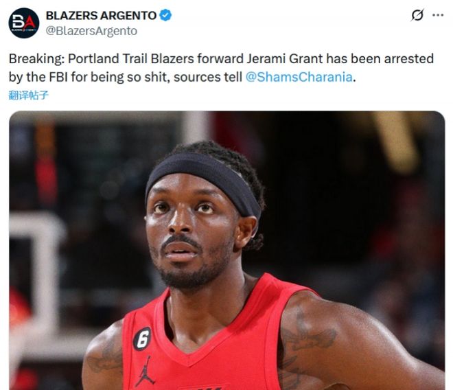 此前传言的开拓者前锋格兰特被逮捕,则属于美国自媒体自编自导的谣言。