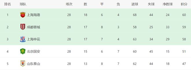 - 中超 | 中超实时积分:海港2分领先,蓉城取胜则升榜首,申花暂第三