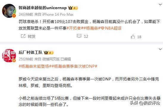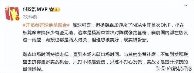 媒体人“盛哲”发文点评:“对瀚森来说,生涯第一次被DNP,前面三个中锋竞争者,不算美妙。