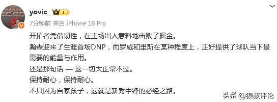 开拓者中文记者“yovic”发文点评:开拓者凭借韧性,在主场出人意料地击败了掘金。瀚森迎来了生涯首场DNP,而罗威和里斯在某种程度上,正好提供了球队当下最需要的能量与作用。还是那句话 — 这一切太正常不过。保持耐心,保持耐心。不只因为自家孩子,这就是新秀中锋的必经之路。
