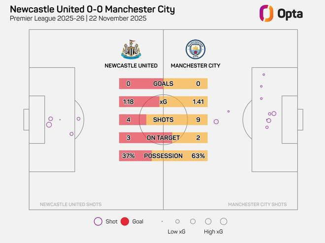 此外,本场比赛前45分钟纽卡的预期进球数达到了1.18球,曼城则为1.41球,合计达到了2.59球,这是英超自2012-13赛季以来,所有上半场没有进球的比赛中两队合计预期进球数第二多的比赛。