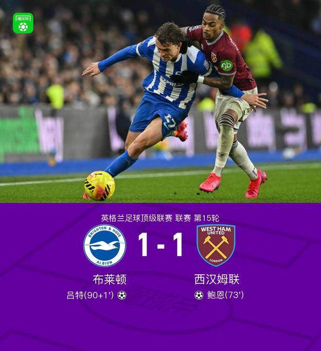 - 英超 | 布莱顿11西汉姆,鲍恩小角度倒地破门,吕特扳平比分