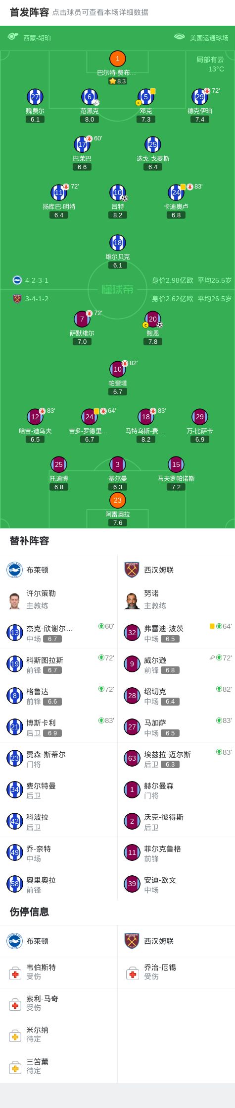 布莱顿11西汉姆,鲍恩小角度倒地破门,吕特扳平比分