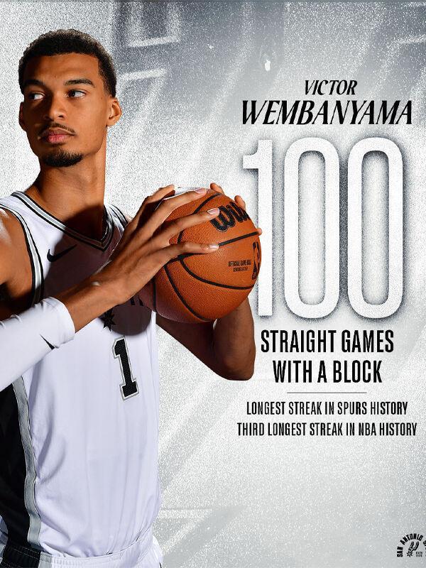- NBA | 文班亚马连续100场比赛送出封盖创造马刺队史纪录